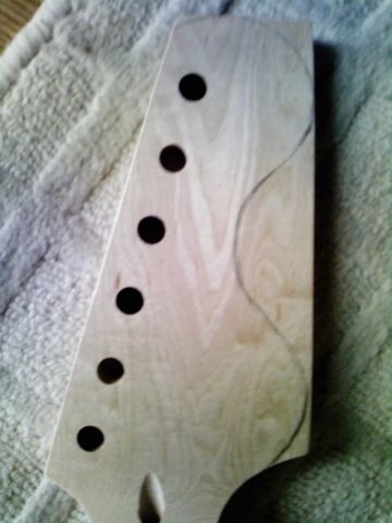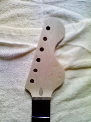 ・ フレット打ち済・加工済、糸巻き通しの穴掘削済でヘッド未加工・未塗装、のネック。
